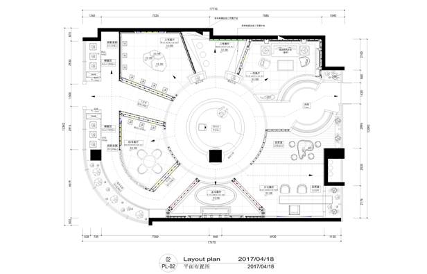 1、此方案平面采取中心圓弧形分割,放射形格局,最大化利用空間,圓形收銀臺(tái)坐鎮(zhèn)中間,可以同時(shí)兼顧兩個(gè)入口的人流動(dòng)向,也可以照應(yīng)到每個(gè)小展廳顧客的動(dòng)向,便于及時(shí)促單,提高成交率。